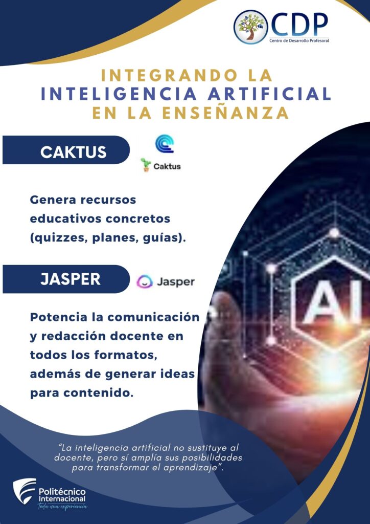 Gracias a la valiosa alianza entre Fundación Telefónica, Visión Social y el Politécnico Internacional, el Centro de Desarrollo Profesoral pone a disposición de los docentes una oferta formativa innovadora a través de la plataforma ProFuturo. Esta iniciativa incluye cursos especializados en el uso pedagógico de herramientas de inteligencia artificial como ChatGPT, orientados a fortalecer las competencias digitales, promover metodologías activas y enriquecer la práctica educativa. Esta oferta refleja nuestro compromiso con la actualización permanente del cuerpo docente y con una enseñanza transformadora, pertinente y de calidad.