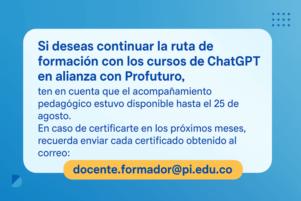 Gracias a la valiosa alianza entre Fundación Telefónica, Visión Social y el Politécnico Internacional, el Centro de Desarrollo Profesoral pone a disposición de los docentes una oferta formativa innovadora a través de la plataforma ProFuturo. Esta iniciativa incluye cursos especializados en el uso pedagógico de herramientas de inteligencia artificial como ChatGPT, orientados a fortalecer las competencias digitales, promover metodologías activas y enriquecer la práctica educativa. Esta oferta refleja nuestro compromiso con la actualización permanente del cuerpo docente y con una enseñanza transformadora, pertinente y de calidad.